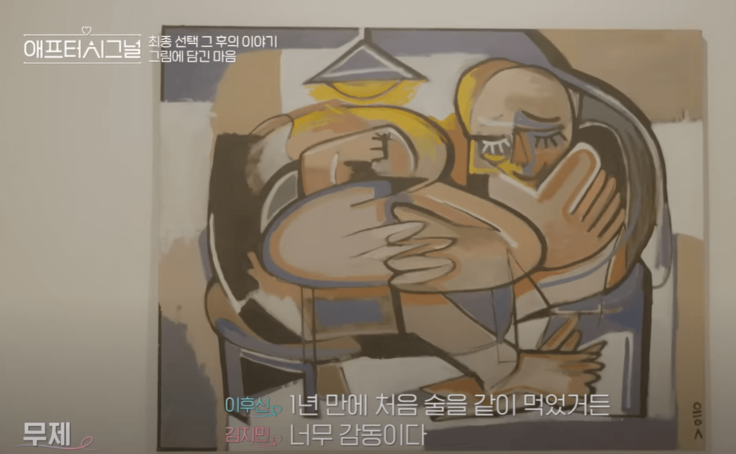전에 사귀었던 여자 친구와 첫 술을 마시는 모습을 생각하며 그린 '무제' 이 그림을 설명하며 후신~